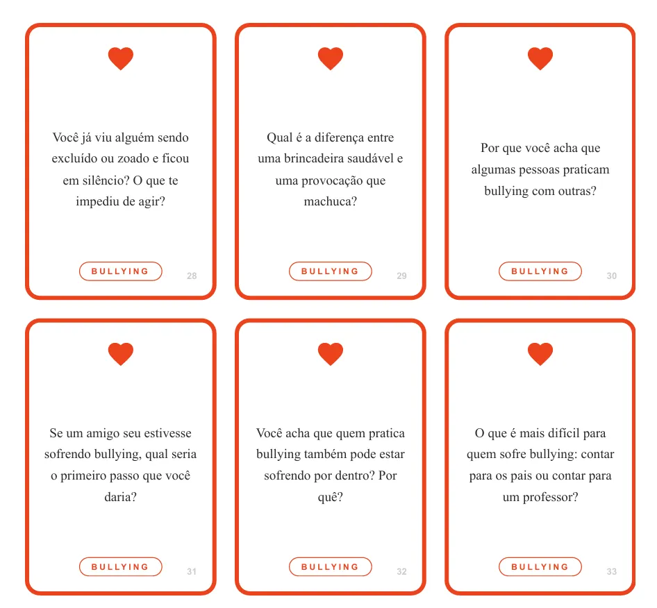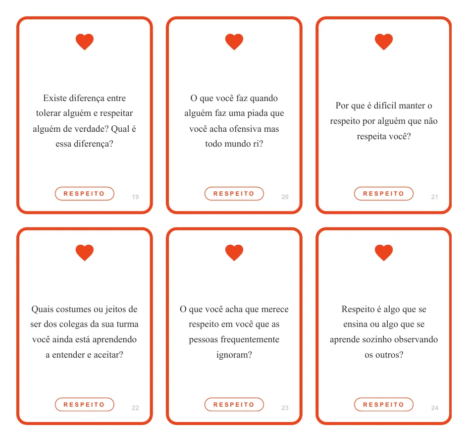 Cards com perguntas específicas para discutir respeito no ambiente digital e prevenir situações de cyberbullying.